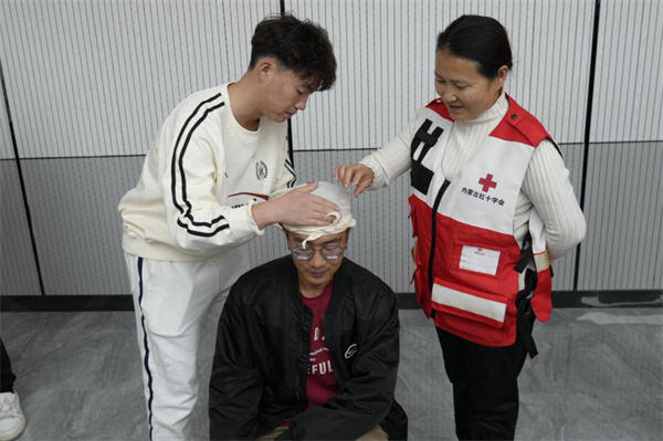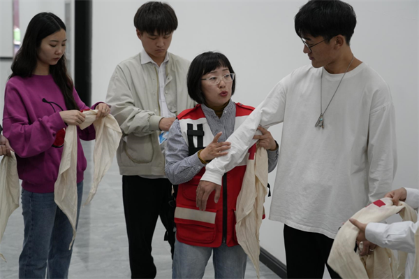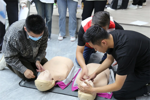 实操训练中,红十字会老师分组指导,重点对清理口腔异物、开放气道、胸外心脏按压、人工呼吸等环节的操作要领和流程进行了细节讲解和示范。参训师生在培训老师的带领下积极参与模拟训练,利用人体模型反复练习并掌握了徒手心肺复苏(CPR)的流程及操作要领,利用绷带、止血带等教具掌握几种常见创伤急救措施。