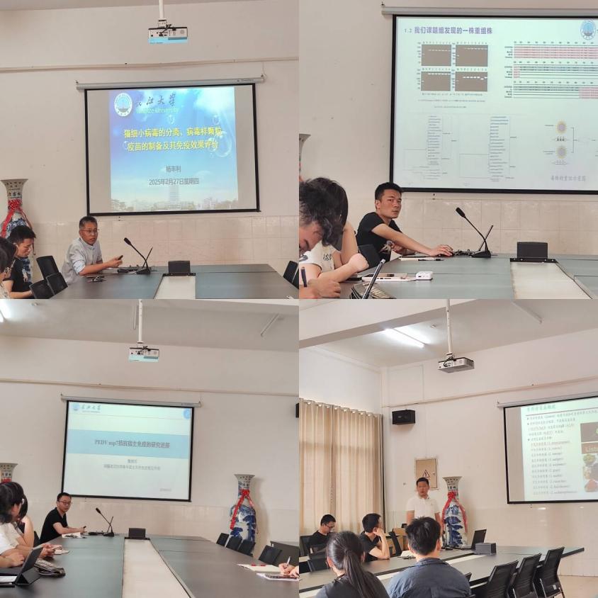 2025年4月17日下午2:00,天游ty8线路1线路2检测中心第五期“求实导师学术沙龙”在五号教学楼1005会议室顺利举行。本次活动共有四位研究生导师进行学术分享,吸引了众多师生参与交流。 首先,杨丰利老师围绕猫细小病毒(FPV)及病毒样颗粒疫苗的制备展开介绍。他详细讲解了通过粪便和肠道样本分离病毒的方法,并分析了疫苗的免疫效果评价体系,为猫细小病毒防控提供了新思路。谭磊老师随后分享了宿主蛋白Haspin激酶在促进伪狂犬病毒(PRV)感染中的作用机制。他阐述了PRV的病原特性及Haspin激酶如何调控病毒感染过程,为抗病毒药物研发提供了潜在靶点。张健淞老师以猪流行性腹泻病毒(PEDV)为例,探讨了冠状病毒nsp7蛋白对宿主天然免疫的调控作用。研究发现,nsp7能抑制干扰素相关启动子的激活,这一发现为理解冠状病毒免疫逃逸机制提供了重要依据。最后,方春老师介绍了单增李斯特菌的分布特征、感染过程及抗酸应激机制,重点解析了该病原菌在宿主体内的适应策略,为防控人畜共患病提出了新见解。 本次沙龙为师生提供了前沿的学术交流平台,展现了学院在动物病原研究与疫苗开发领域的科研实力,进一步推动了学科交叉与创新合作。 (审核 苏应兵 编辑 王海艳 )